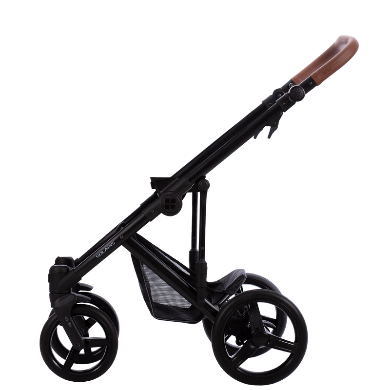 Шасси Solaris Pro складывается как «книжка». Рама легкая, произведена из алюминия. Ручку можно регулировать по высоте, она покрыта экокожей, чтобы было удобно и приятно управлять коляской. Колеса в модели полиуретановые, ненадувные. На передних установлены механизмы поглощения колебаний и памяти направления. На задних стоят амортизаторы, также амортизационная система с регулировкой оборудована на раме. В коляске установлена тормозная система по типу «качельки». Корзина для багажа вместительная, съемная, открытого типа.