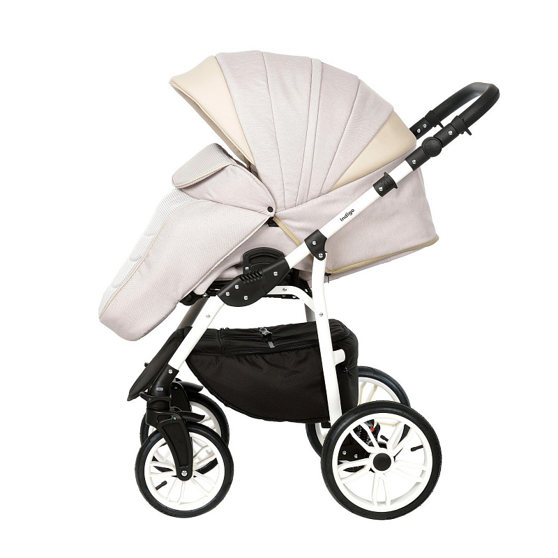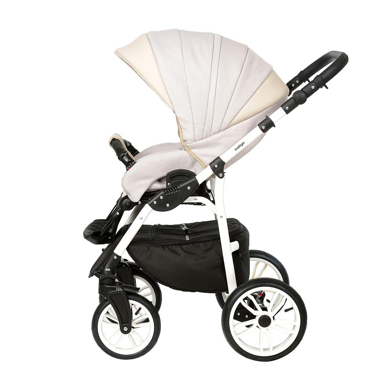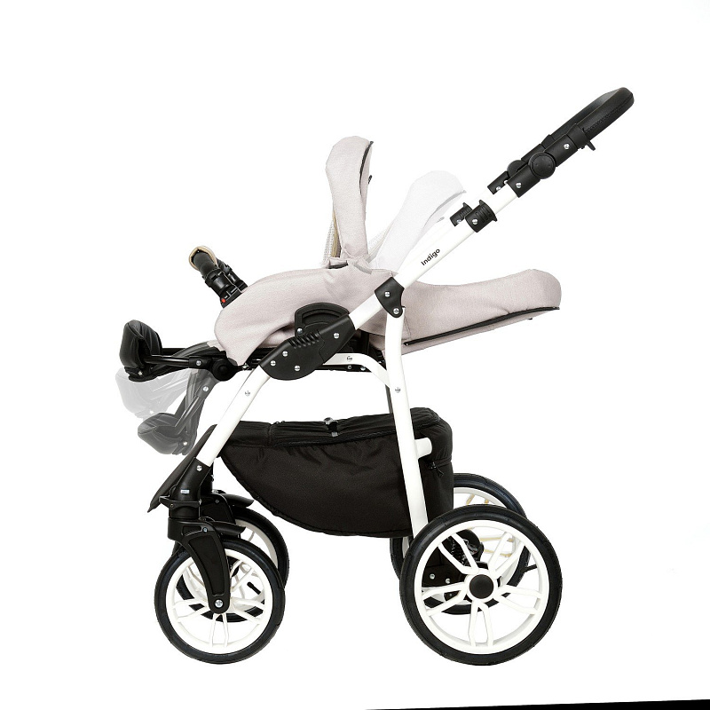 Рама облегченная, алюминиевая. Модули крепятся к ней с помощью системы One Touch Sistem, которая существенно упрощает задачу родителям. Амортизаторы в коляске Indigo пружинные, тормоз центральный — Stop&Go. Благодаря системе выдвижных осей эту модель можно свободно перевозить в багажнике автомобиля, не боясь ничего поцарапать. Багажная корзина текстильная, закрытого типа. Колеса резиновые, надувные, с поворотной опцией у передних.