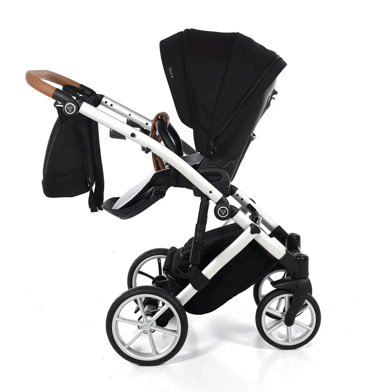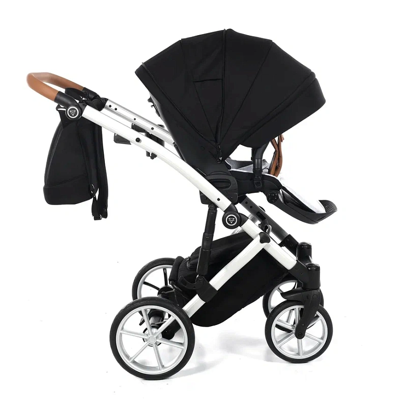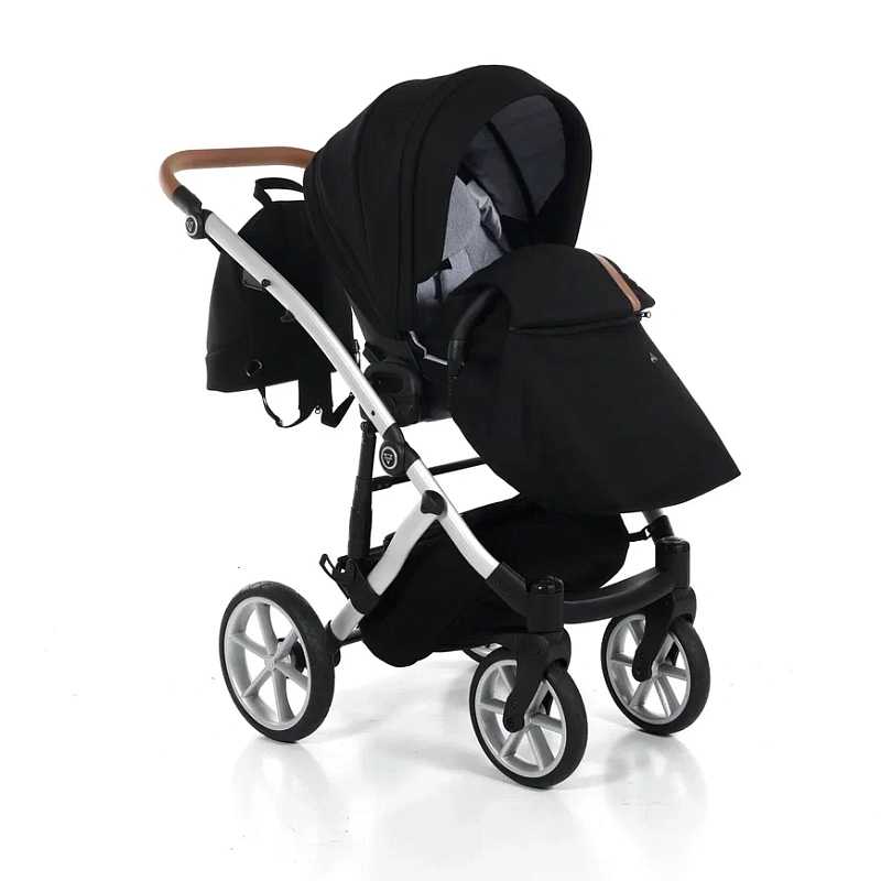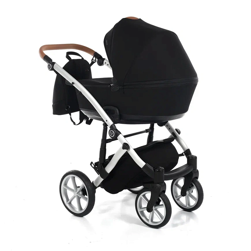 Рама алюминиевая — легкая, прочная, с элегантным покрытием белого цвета. Колеса в Junama гелевые, не нуждаются в подкачивании и не боятся проколов. Передние колеса для лучшей маневренности оснащены поворотной функцией. Система амортизации состоит из трех пар подвесок с регулировкой жесткости. Вместе с противоударной системой «антишок» они дают плавный и тихий ход коляске. На задних колесах установлен центральный тормоз. Корзина закрытая, компактная. Ручка имеет регулировку по высоте, покрыта искусственной кожей, за которую приятно держаться.