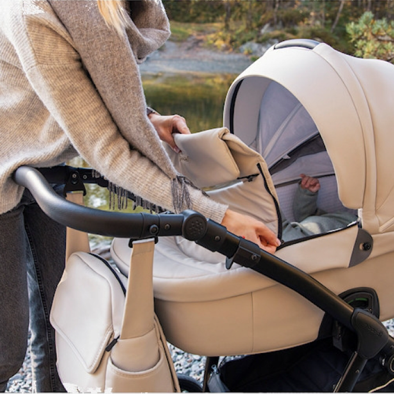 Коляска «Фьорди», выпущенная в 2021 году, дополнена сумкой-рюкзаком, дождевиком, москитной сеткой, подстаканником.