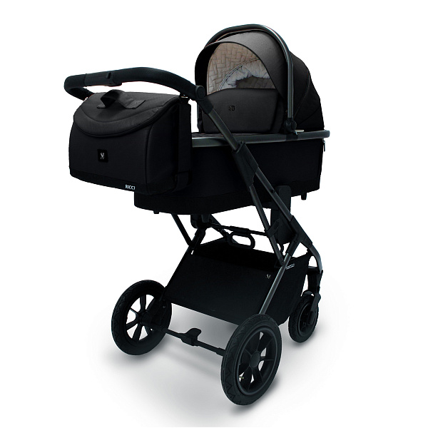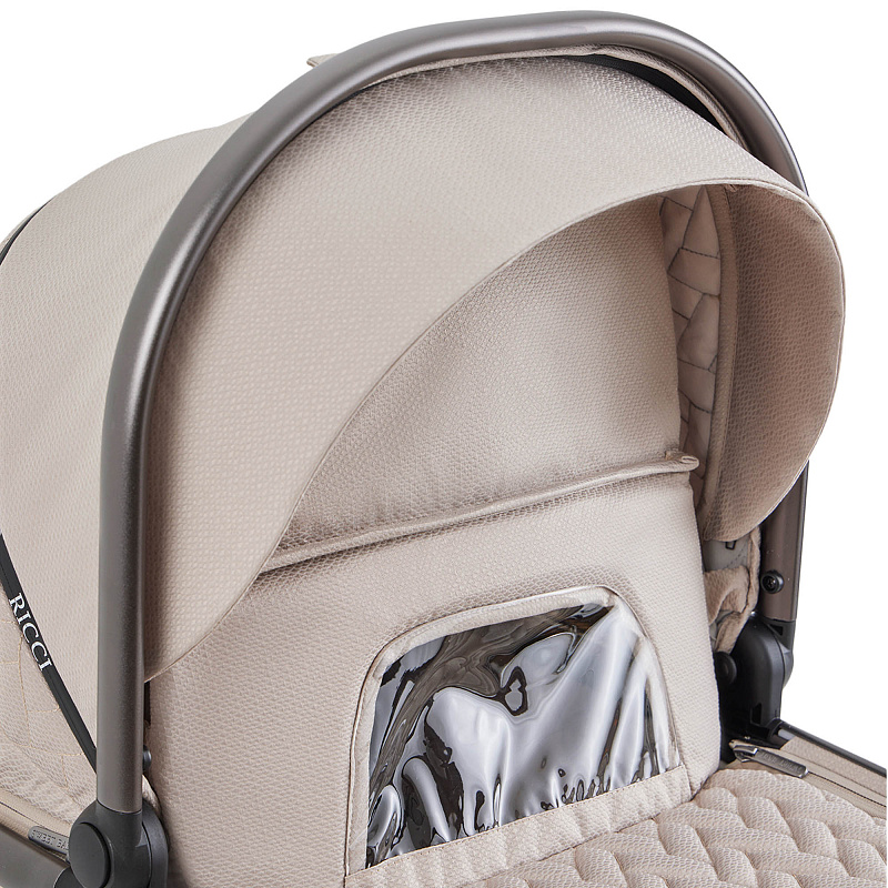 У модели Ricci большой и просторный спальный модуль. На дне люльки приделаны ножки, чтобы можно было превращать спальный блок для коляски в колыбель. Люлька комплектуется матрасиком с непромокаемым чехлом. Регулировка капюшона бесшумная: это важно, чтобы регулировать капюшон и не будить малыша. Спальный блок легко отсоединяется и присоединяется к каркасу при помощи системы Memory Button. Накидка на ножки целиком закрывает кроху, поэтому ребенку будет комфортно гулять даже в ветренную погоду. Если на улице жарко, оборудовано сразу две вентиляционных системы: на капюшоне и на дне люльки..