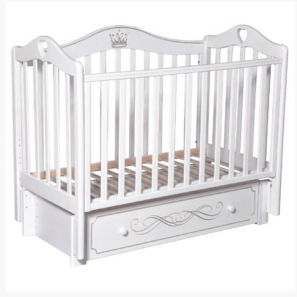 Karolina 55 располагает тремя положениями подматрасника по высоте. На фигурной стенке нанесена декоративная резьба. Передняя стенка съемная, регулируется по высоте в двух положениях. Имеются накладки ПВХ для защиты мебели и детских зубов. Ящик закрытый и функциональный, вмещает немало вещей, хорошо защищает их от пыли. На фасад ящика нанесен декор. Матрас, постельное белье в комплекте отсутствуют. Нет в кроватке и колес.