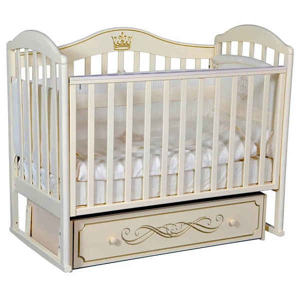 Маятник дает возможность качать ребенка в двух направлениях, а также фиксировать в статичном положении. Боковины регулируются, передняя боковая часть при необходимости снимается. На боковушках надеты обязательные для детской мебели накладки из силикона для детских зубов. Место для сна — 120x60 см. За счет ящик для игрушек и постельных принадлежностей кроватка весит 34 кг.
