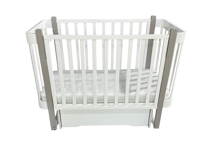 На передней стенке оборудован курок, благодаря которому можно менять высоту переднего бортика. Также есть вариант его полностью убрать, чтобы использовать кроватку как диванчик. Ящик удобно располагается внизу и будет удобен для складывания постельных принадлежностей.