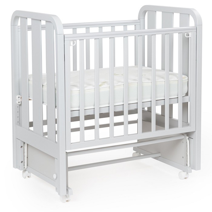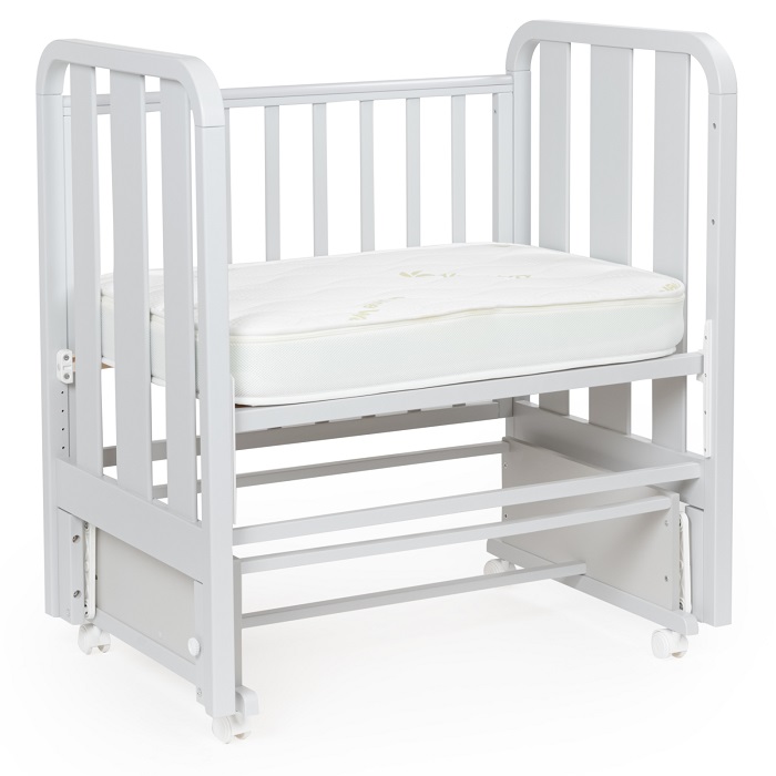 Кроватка совместима с матрасиком размером 90x60 см. Толщина матрасика – 12 см. На боковинах есть накладки из силикона. Мебель произведена в России.