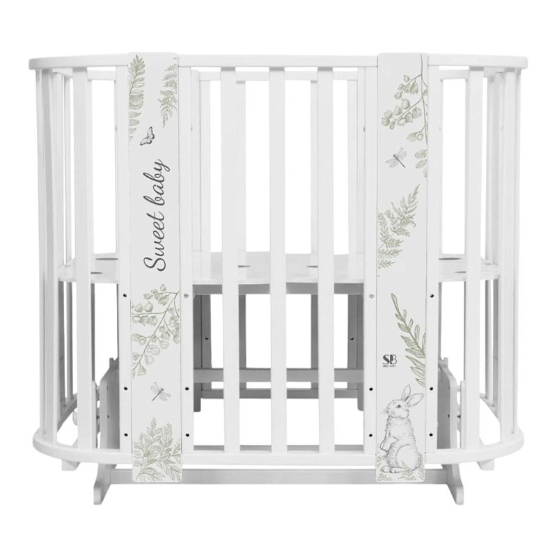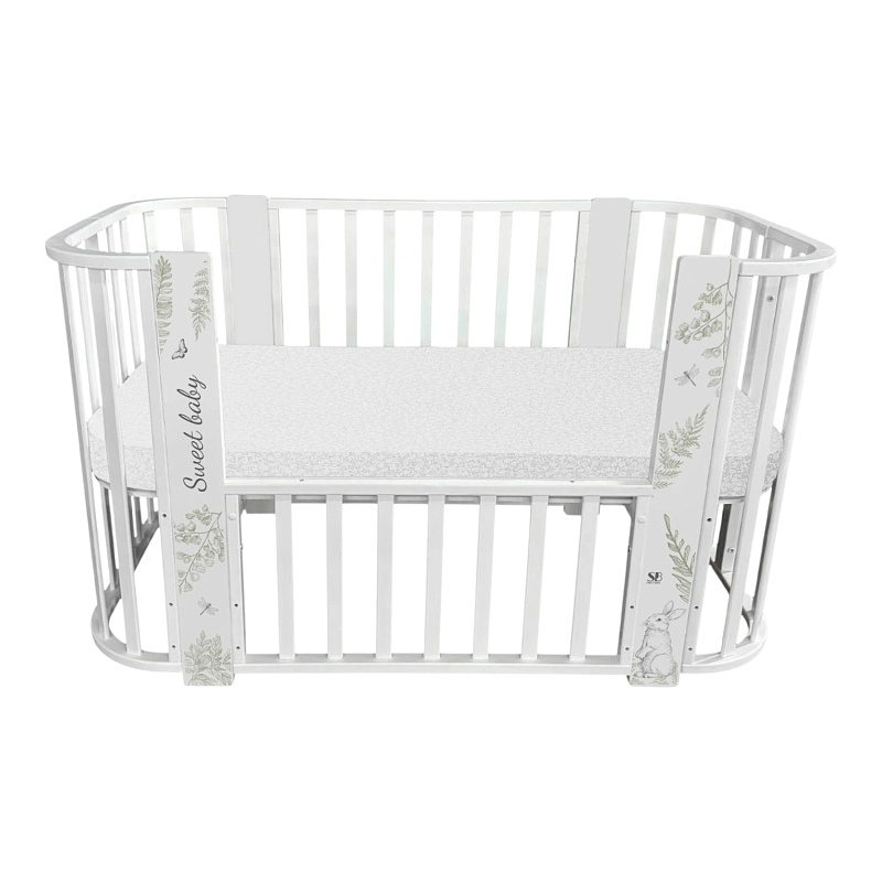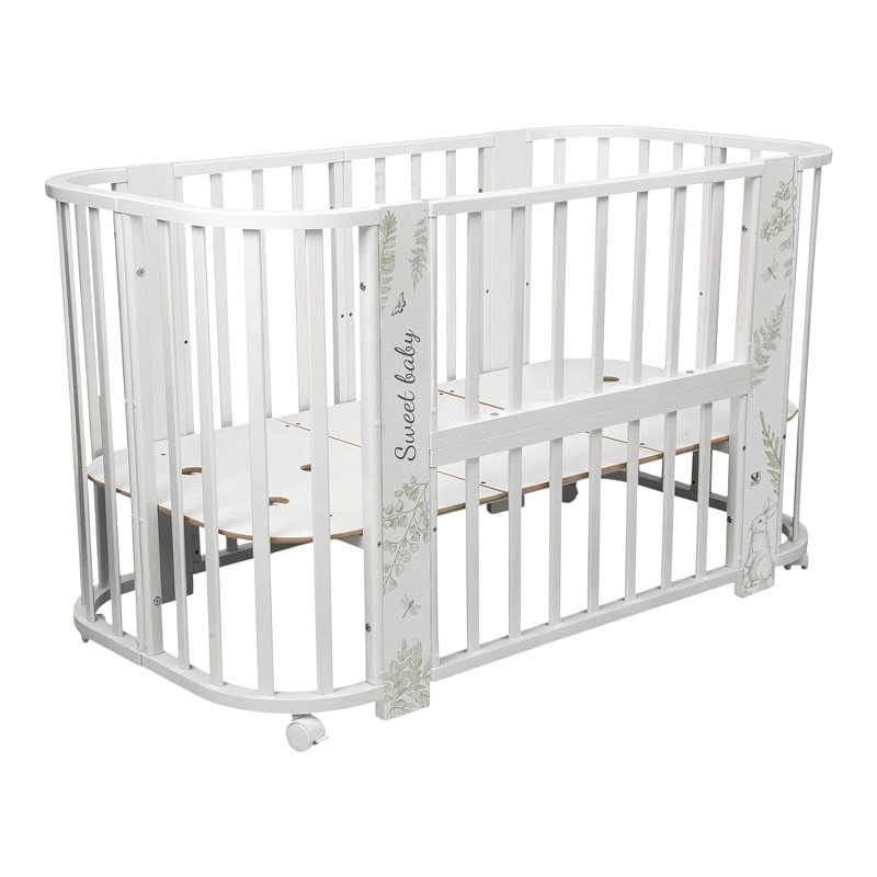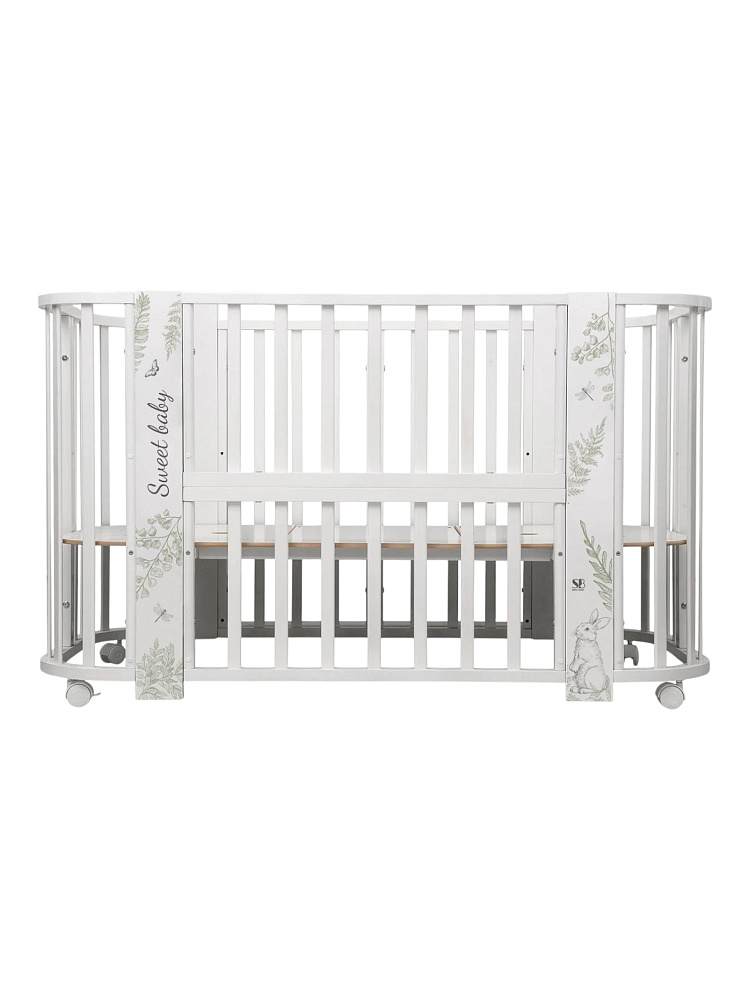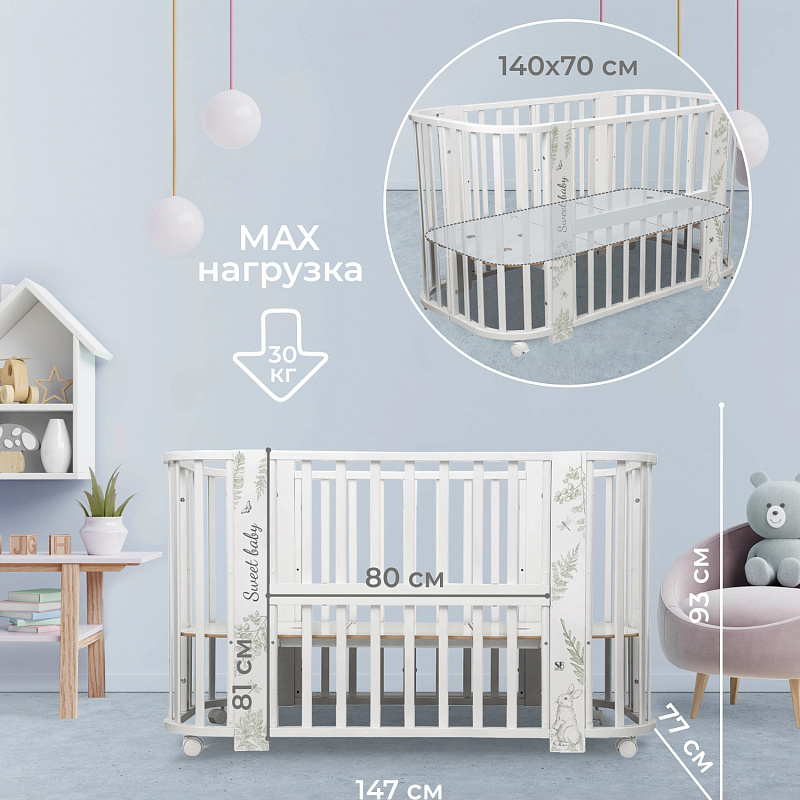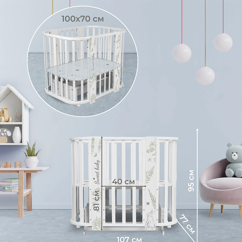 Sweet Baby Arte предлагает пять вариантов трансформации: просторная кровать для подросших детей, компактная люлька для новорожденных, приставная кроватка для совместного сна, диванчик для отдыха и игровой манеж. Эти конфигурации делают кроватку универсальной, подходящей для использования на протяжении нескольких лет.