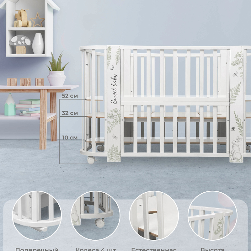 Кроватка изготовлена из экологически чистых материалов, безопасных для ребенка и окружающей среды. Прочная конструкция соответствует современным стандартам, обеспечивая надежность и долговечность. Высокие бортики с закругленными краями гарантируют безопасность во время сна и игр, а три уровня высоты ложа позволяют настроить кроватку под удобство родителей и возраст малыша.