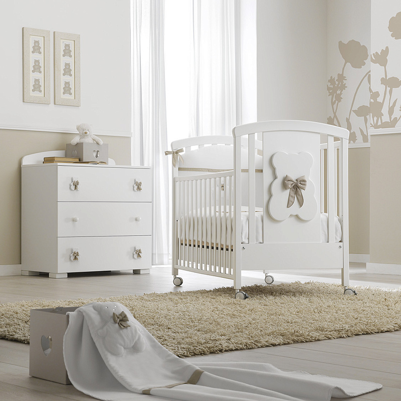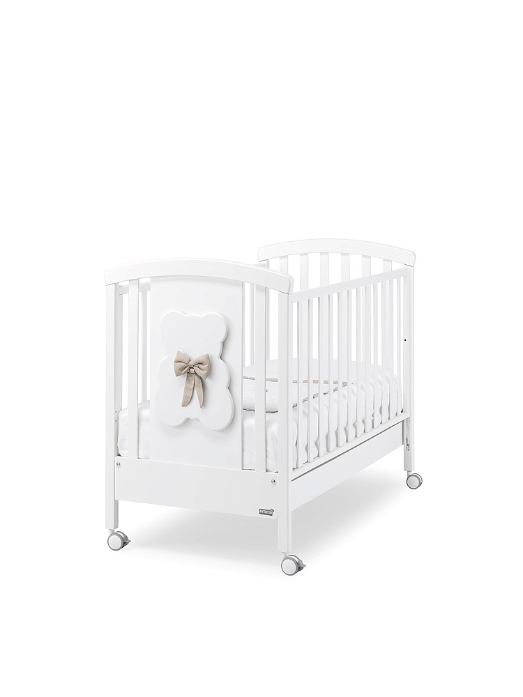 Кровать для ребенка с рождения Erbesi Dudu украшена аппликацией медвежонка с бантиком. Это классическая мебель на колесиках с двумя стопорами и резиновыми накладками. Боковые стенки регулируются системой secur-baby. Вы сможете одной рукой опустить и поднять боковину. Мебель изготовлена из натурального бука, окрашена не причиняющими вреда здоровью ребенка красками, покрыта экологичными лаками.
