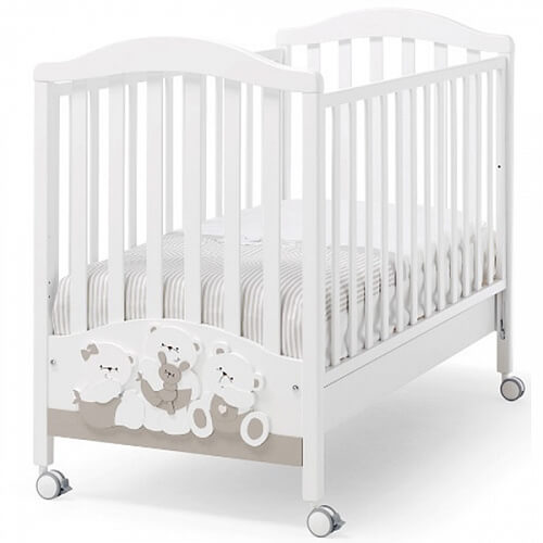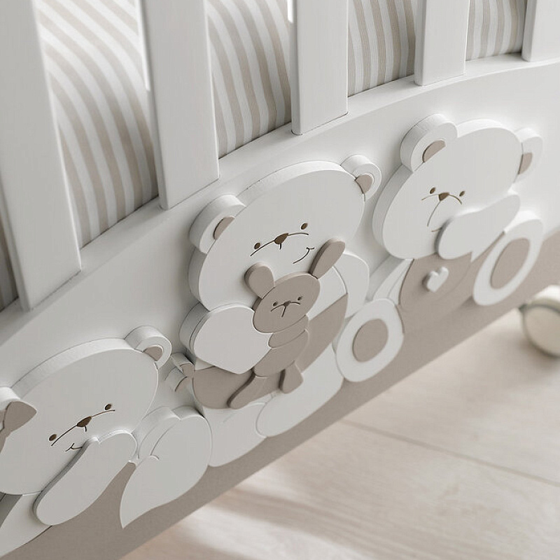 Роскошное творение итальянских производителей подойдет детям до 4 лет. Кроватка Erbesi выполнена из массива бука и покрашена экологически чистыми лакокрасочными материалами, что отвечает всем европейским стандартам качества. Модель белоснежно белая с вкраплением серого цвета в месте аппликации с тремя мишками и зайчиком. Благодаря дизайну и цвету кроватка вольется в любой современный интерьер комнаты.