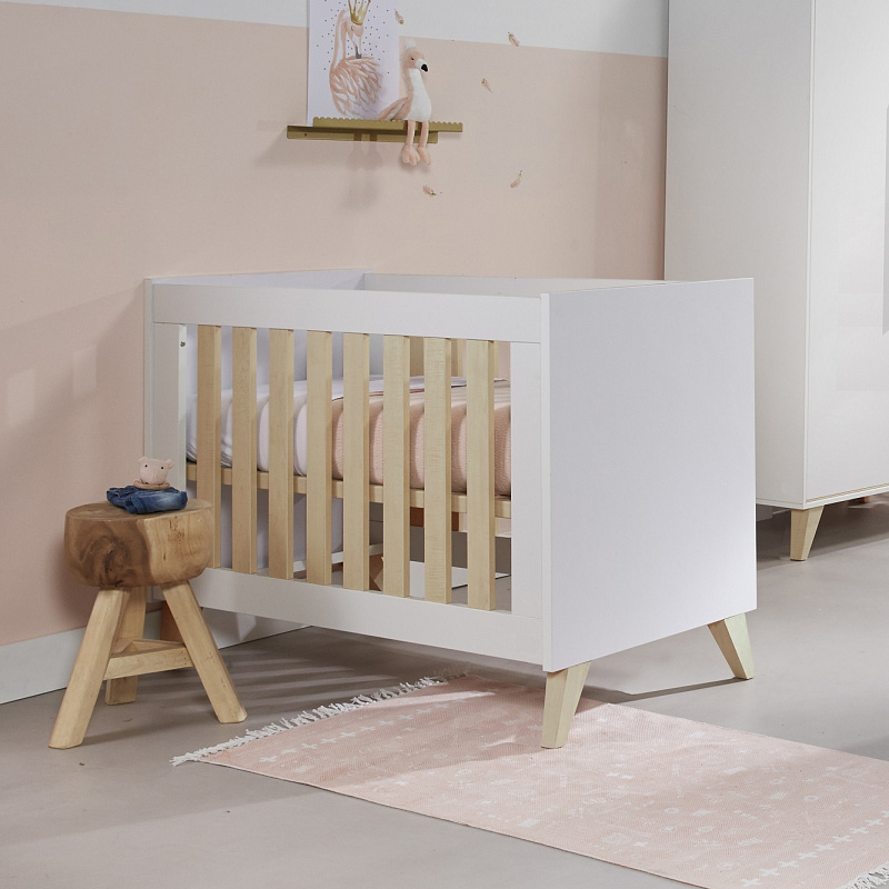 IKid Lazio – кроватка, сделанная в современном лофтовом дизайне. Каркас кровати белый, дополняется ламелями натуральных расцветок.
