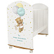 У этой модели фигурная спинка. Колеса идут в комплекте. Прутья размещены на безопасном расстоянии для ребенка. Передняя стенка регулируется по высоте. Боковые части кроватки украшены изображением сказочных животных — медвежонка, лисенка и слоненка.