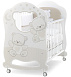 Кроватка изготовлена из экологичных материалов. На фасаде есть декоративные элементы и кристаллы. Колесики, идущие вместе с кроваткой, резиновые, бесшумные, снабжены качественным стояночным тормозом. Бортики кроватки легко регулируются по высоте, поднимаются и опускаются одной рукой. В комплекте имеется ящик для белья.