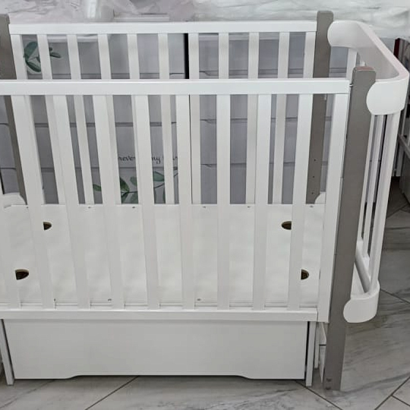 Размер спального места кроватки Кедр Adele с ящиком — 120х60 см. Высота ложа регулируется в четырех положениях, чтобы адаптироваться к возрасту ребенка: чем старше малыш, тем ниже опускается спальное место. Передняя стенка оборудована механизмом автоспуска на курке, что позволяет легко изменить её положение или полностью снять для использования кроватки в качестве диванчика.