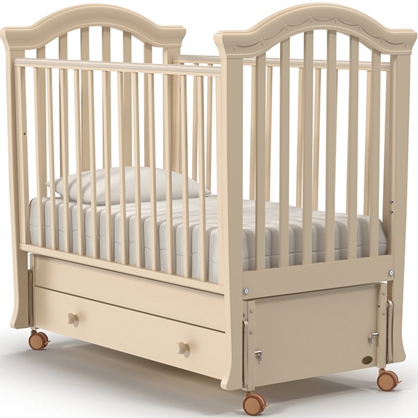 Помимо красивого внешнего вида модель демонстрирует хорошие функциональности возможности. Основание регулируется по высоте, передняя решетка опускается или полностью демонтируется. Плавное укачивание малыша обеспечивает продольный маятник. Колесики плавно передвигаются по полу, не оставляя следов, а большой ящик вмещает спальные принадлежности и детскую одежду.