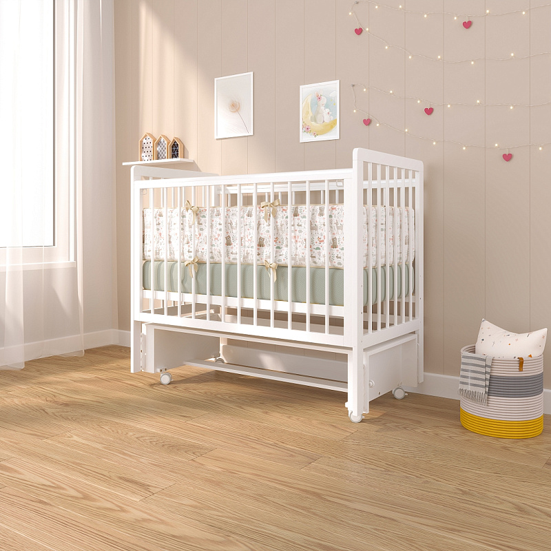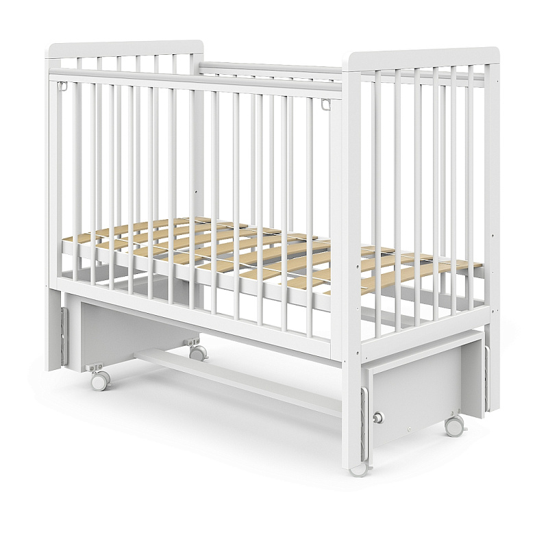 Кроватка оснащена продольным маятниковым механизмом, который создаёт мягкое укачивание, помогая малышу быстрее засыпать. При необходимости маятник легко фиксируется. Спальное ложе регулируется по высоте в трёх положениях, адаптируясь под возраст ребёнка. Передняя стенка с функцией автоспуска быстро снимается, обеспечивая удобный доступ к младенцу.