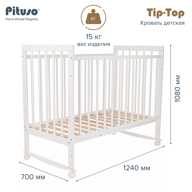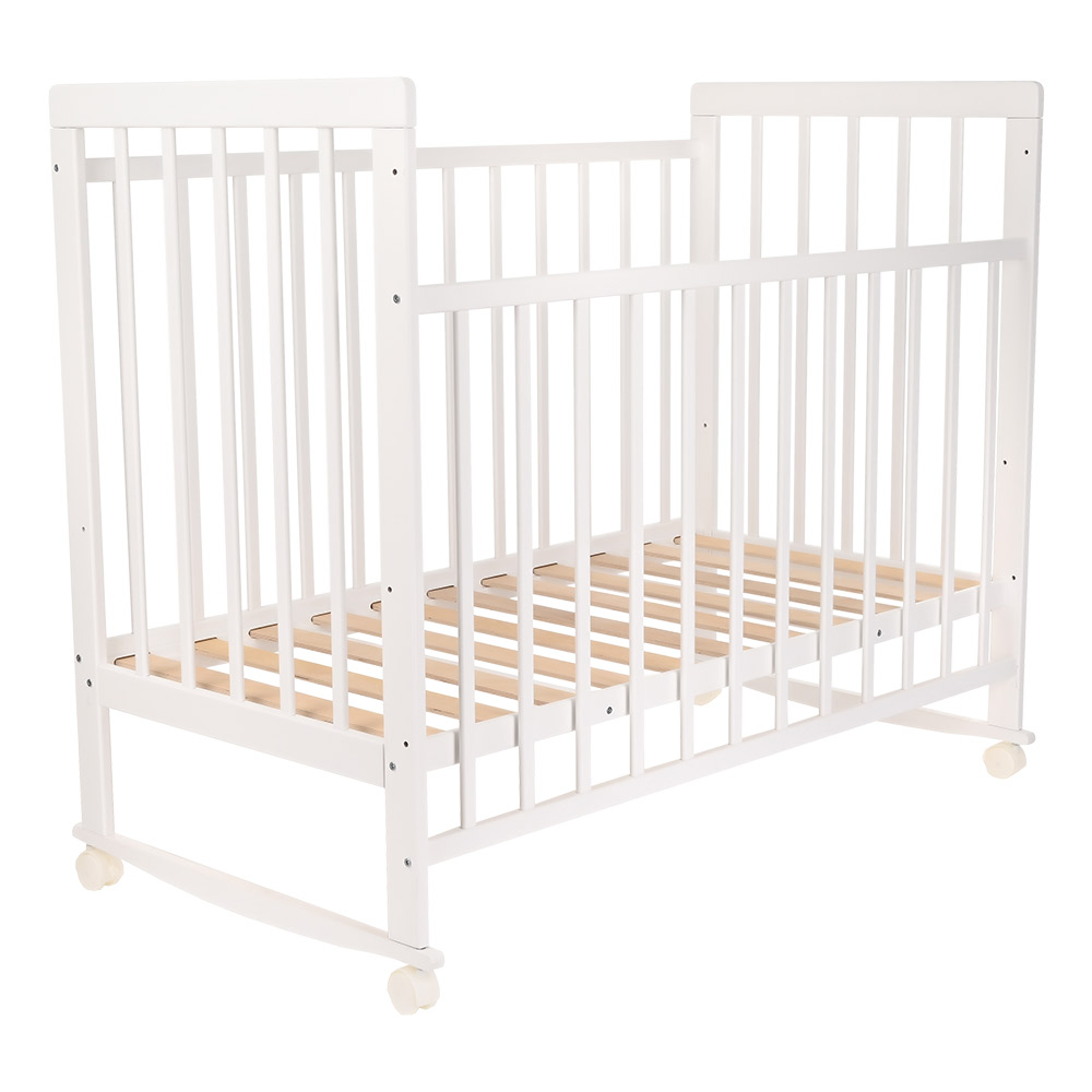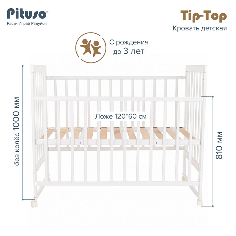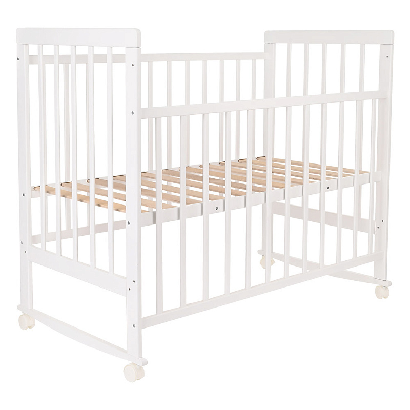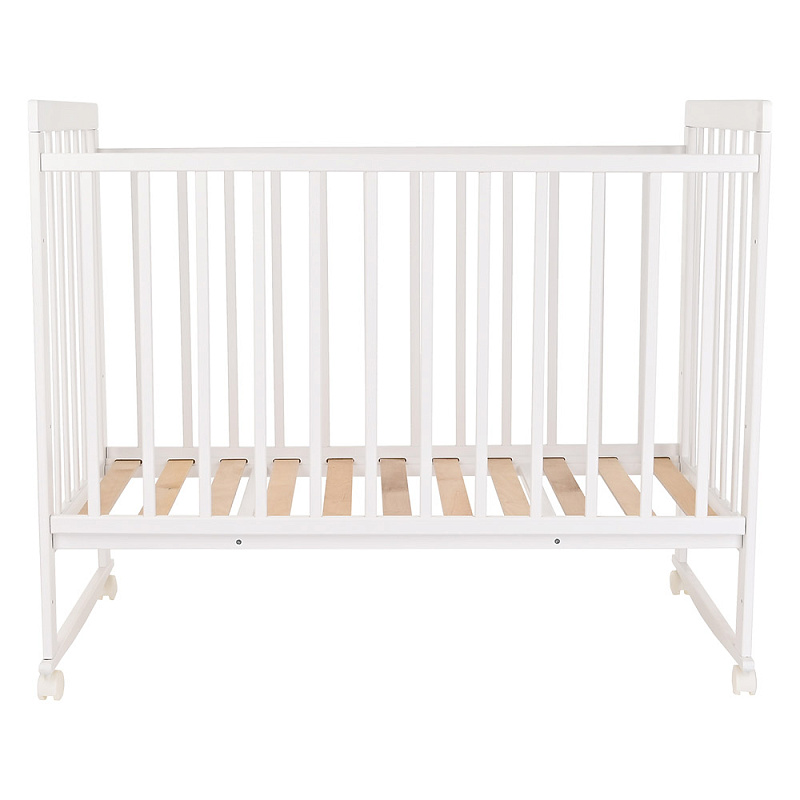 Кроватка снабжена колесиками со стопорами, чтобы можно было зафиксировать предмет мебели в любом месте комнаты. Передняя стенка фиксируется в верхнем и нижнем положениях, что удобно для мамы, когда она кладет и берет на руки ребенка. Обратите внимание, что в этой кроватке переднее ограждение полностью не снимается.