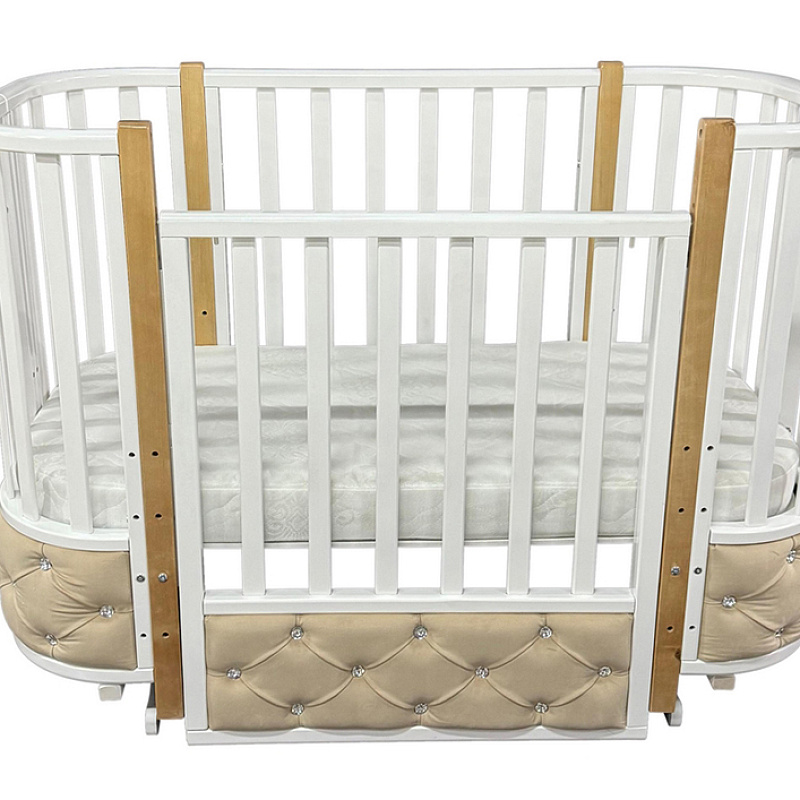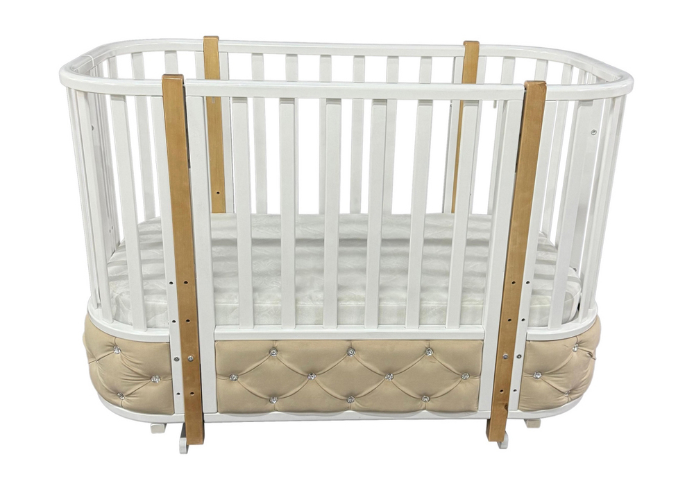 Овальная кровать Esenia 2 оснащена поперечным маятником, колесами, а также велюровой отделкой, которая и отличает эту модель от других той же серии. Кровать подходит малышам с рождения до 3-4 лет. Мебель выполнена из натурального дерева (березы), МДФ и велюровой ткани (низ).