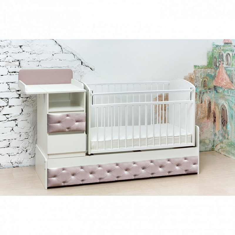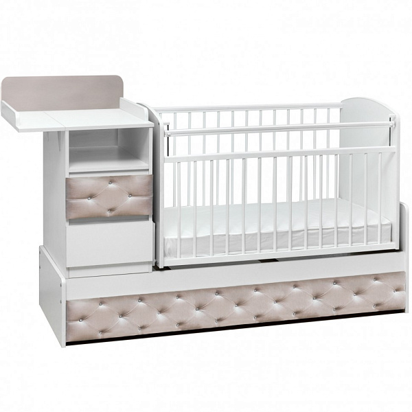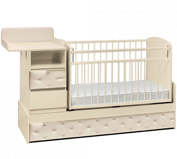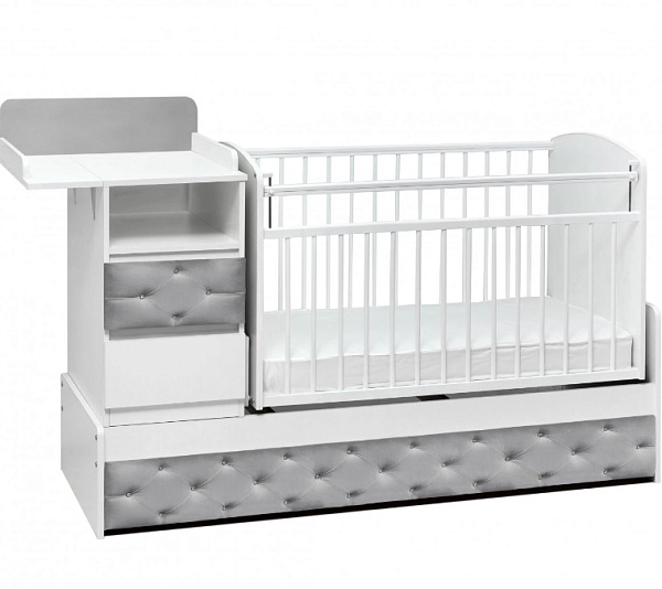 Для новорожденных в конструкции предусмотрена комфортная и безопасная кроватка с удобным столиком для пеленания. Столик съемный, удобный, оснащен мягким бортиком у изголовья. Также в комплектации есть комод.