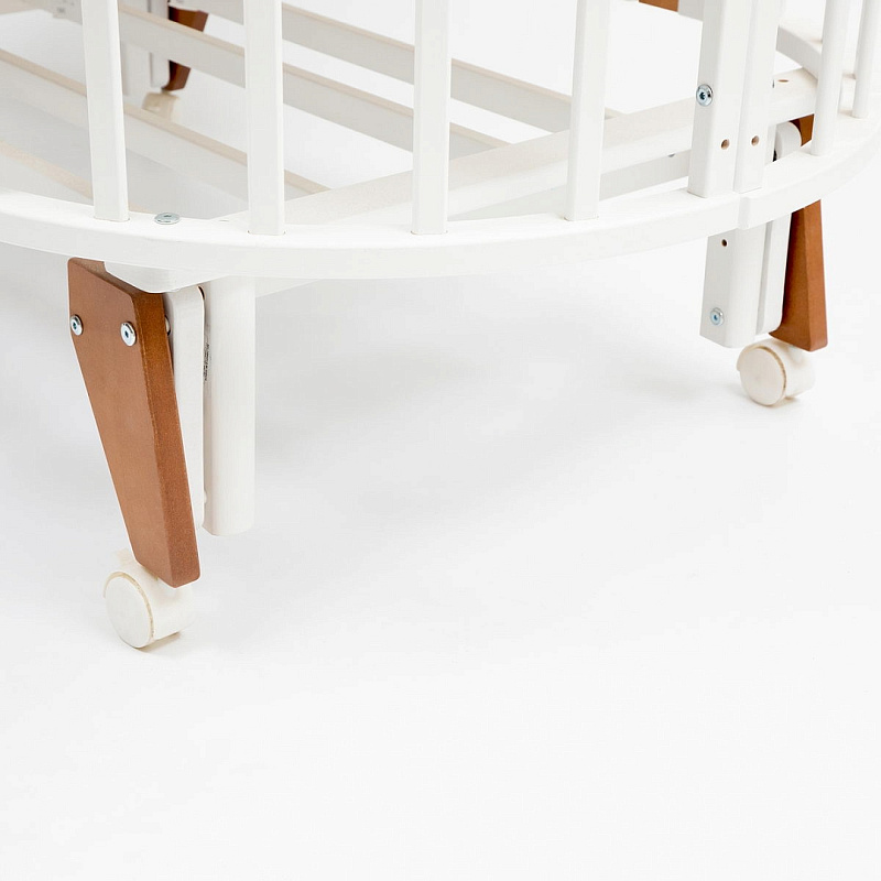 Кроватка трансформируется в круглую кровать и круглую кровать на маятнике, овальную кровать, овальную кровать на стойках или колесах, стол и два стула. Также в комплекте, помимо маятниковых механизмов поперечного и продольного укачивания, есть колеса со стопором.