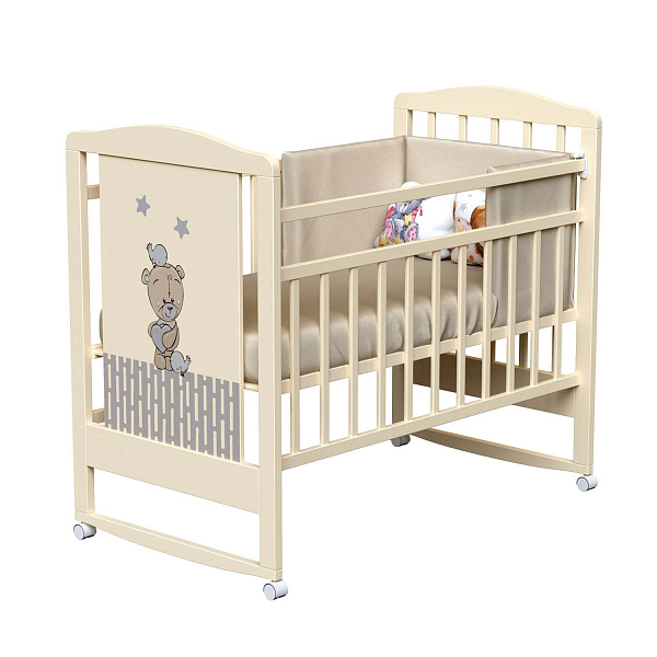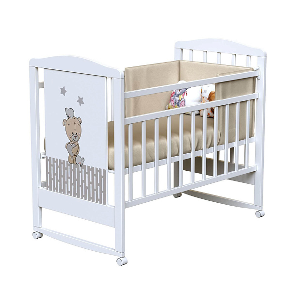 Главный плюс кроватки — ее легкость и мобильность. В ней нет ящика и имеются колесики, благодаря которым родители могут без труда перемещать предмет мебели по дому. Качалка дает возможность укачивать ребенка. Откидная планка добавляет функциональности, а наличие силиконовой накладки для защиты детских зубов и боковой планки — практичности. У кроватки два уровня ложа. Спальное место имеет размеры 120x60 см, поэтому найти матрасик и постельные принадлежности будет несложно. Приобрести все необходимое вы можете в нашем магазине.