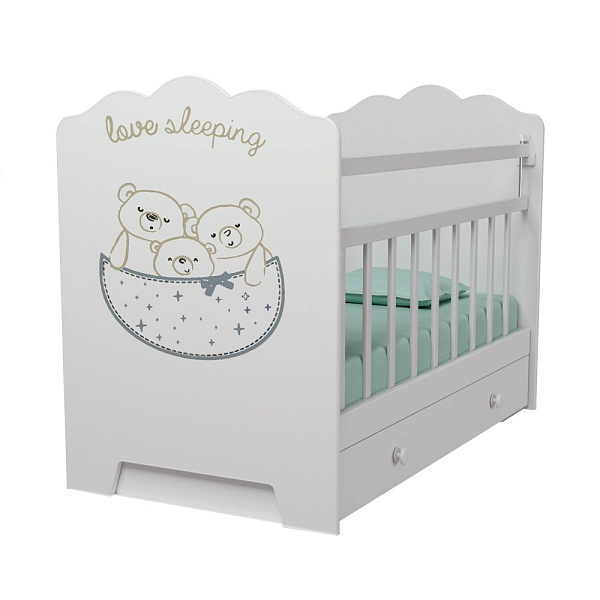 Кровать детская Love Sleeping от российского бренда ВДК — это мебель с поперечным маятником, выполненная из чистой древесины (березы), ЛДСП и окрашенная нетоксичным лаком на полимерной основе. Главное функциональное преимущество кроватки — маятник, главный эстетический плюс — рисунок на спинке, где трое медвежат ложатся спать.