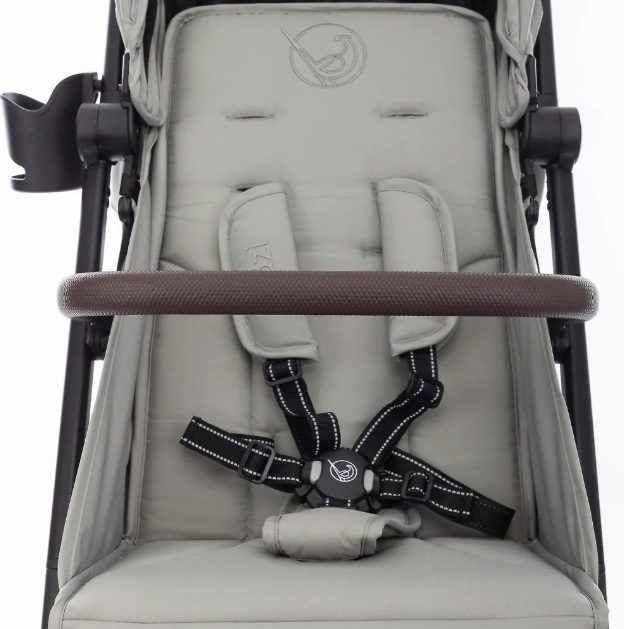 Пятиточечные ремни с мягкими накладками и магнитным замком регулируются по высоте, обеспечивая надежную фиксацию. Съемный поворотно-откидной бампер, обтянутый экокожей, добавляет дополнительную защиту и удобство при посадке малыша.