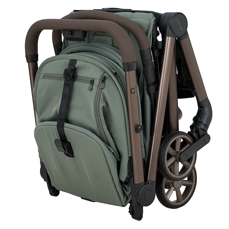 Коляска отличается очень компактными габаритами: без задних колес ее размеры составляют 26×43×50 см, поэтому Q5 легко помещается в багажник автомобиля и может перевозиться как ручная кладь при перелетах. Модель позиционируется как прогулочная коляска с просторным сиденьем и хорошей маневренностью, подходящая для прогулок по городу и поездок, когда важна легкость и компактность. Конструкция складывается одной рукой по типу «книжка», в сложенном виде коляска устойчиво стоит вертикально без опоры, не пачкая ткань и ручку, а для переноски предусмотрен удобный плечевой ремень.