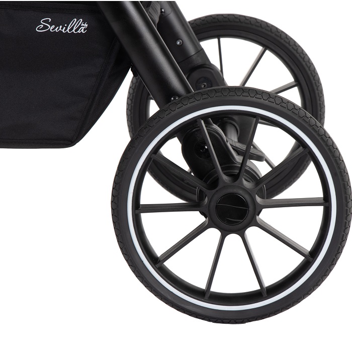 Sevillababy Major – стильная модель-внедорожник с непрокалываемыми колесами имягким ходом. Еще один плюс – просторное сиденье. Коляска при этом мало весит и удобно складывается до компактных размеров.