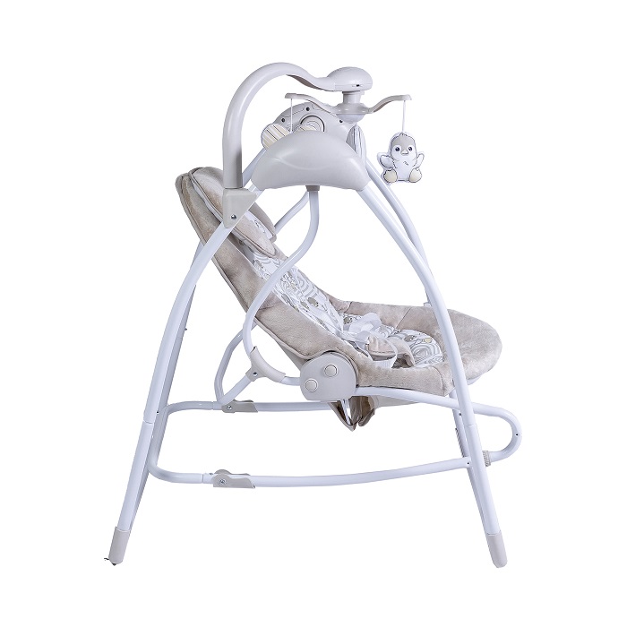 Модель электрокачелей изготовлена из качественных материалов, обеспечивающих ребенку комфорт и безопасность. Для дополнительной защиты установлены специальные ограничители. Качели помогают контролировать уровень шума и скорость укачивания: есть 12 предустановленных мелодий и 5 звуков природы, а также пульт для переключения в комплекте.