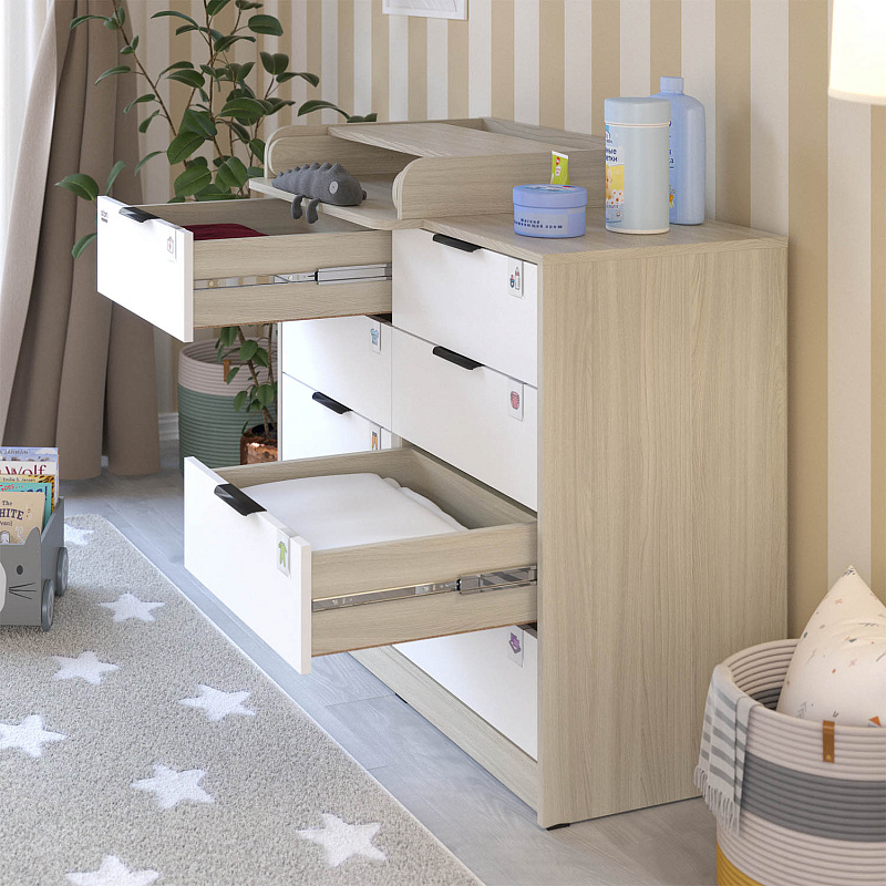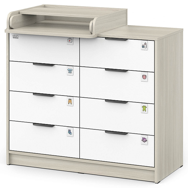 Комод “Зевс” оснащен восемью ящиками и пеленальной доской. Сочетает в себе функциональность и стиль для заботы о ребенке.