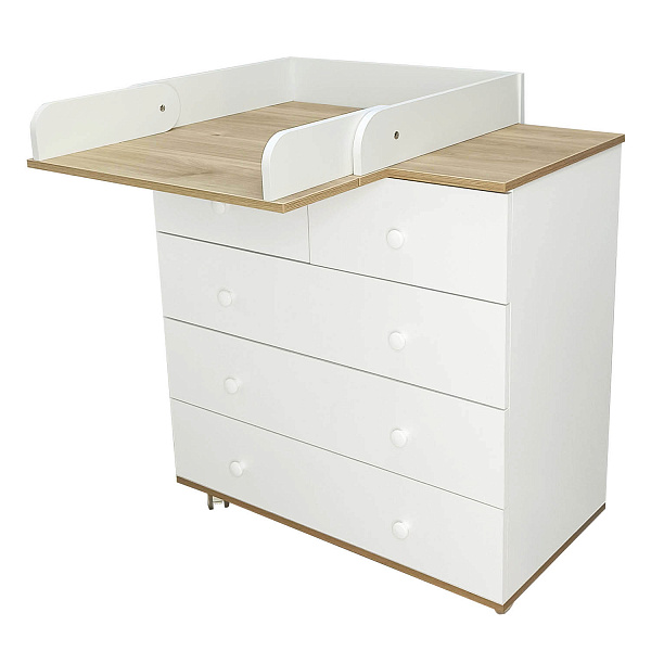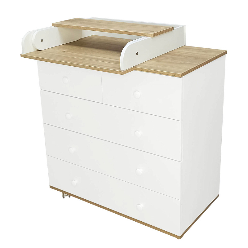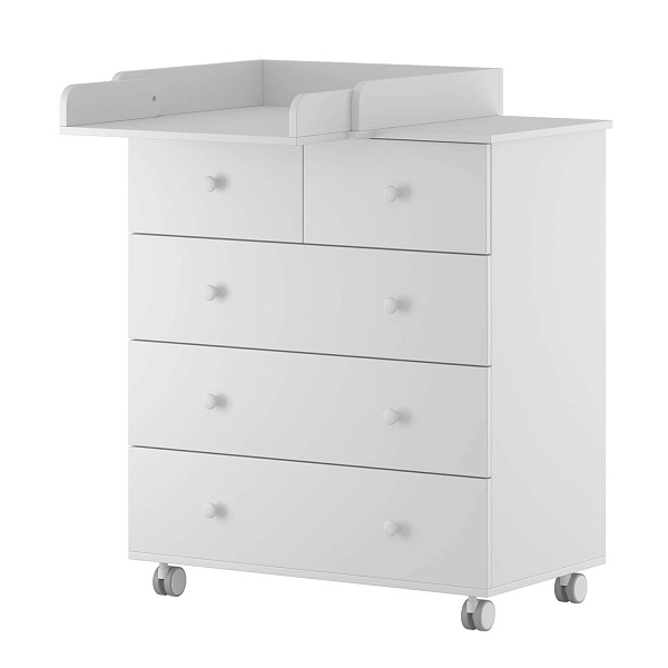 Комод оснащен пятью удобными вместительными ящиками на шариковых направляющих. Когда ребенок подрастет, пеленальный столик превращается в дополнительную полочку для аксессуаров, а комод станет классическим бельевым. Изделие можно передвигать по комнате благодаря прорезиненным колесам.