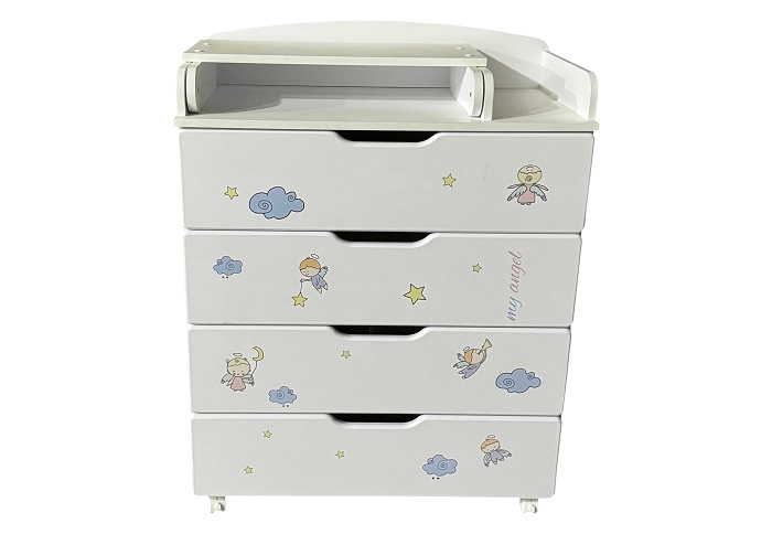 Практичный и функциональный детский комод выполнен в оригинальном дизайне. В комоде четыре вместительных ящика с удобными ручками в виде выемок. Ящики удобно выдвигаются и задвигаются. На поверхности комода оборудован складной пеленальный столик с бортиками безопасности, который в сложенном виде можно использовать в качестве дополнительной полочки.