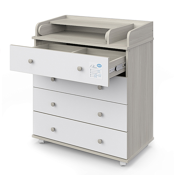 Детский пеленальный комод Атон Орион 800/4 (Oliver) оснащен четырьмя удобными ящиками на шариковых направляющих. В одном из ящиков оборудовано два отделения.