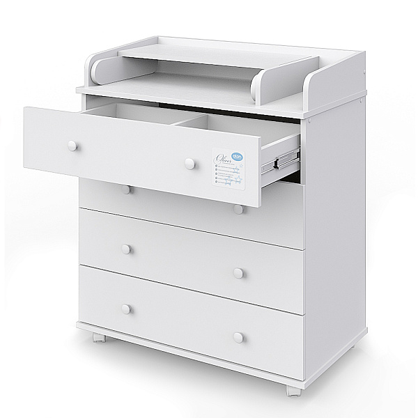 Пеленальный столик раскладывается благодаря надежному скрытому механизму. Комод комплектуется колесиками с системой стопоров. Основание цельное. Корпус выполнен из высококачественной ЛДСП, дно ящика – из белого ХДФ.