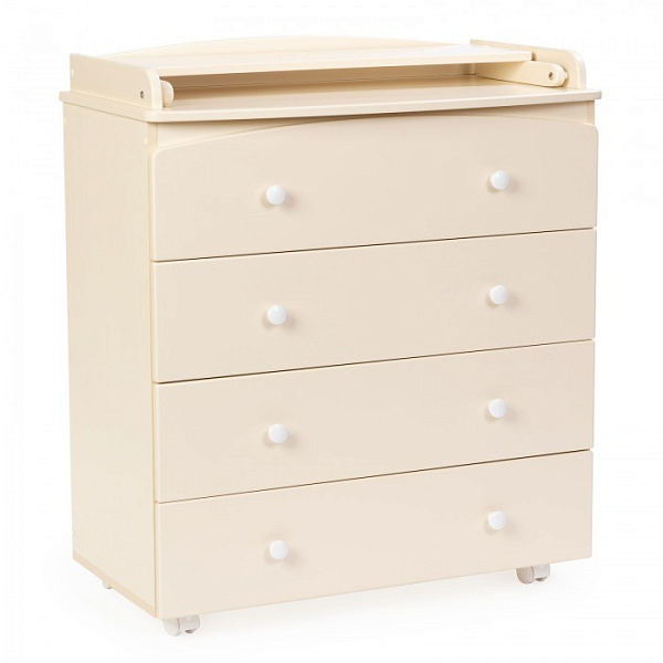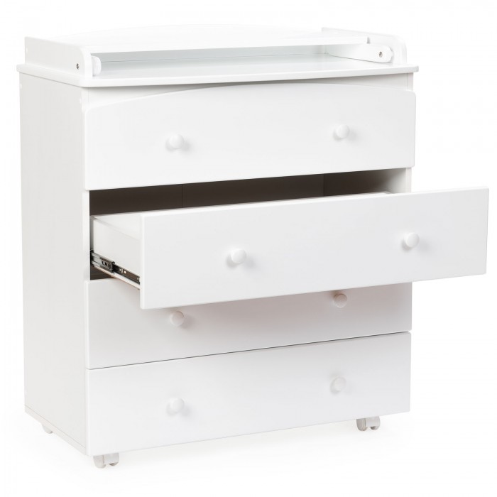 Четыре больших ящика на шариковых направляющих ходят тихо, не разбудят малыша. В них можно поместить всю одежду ребенка, предметы гигиены, другие вещи. Пеленальный столик удобный, быстро и просто раскладывается. Когда ребенок подрастет, его можно сложить и использовать как дополнительное место для вещей.