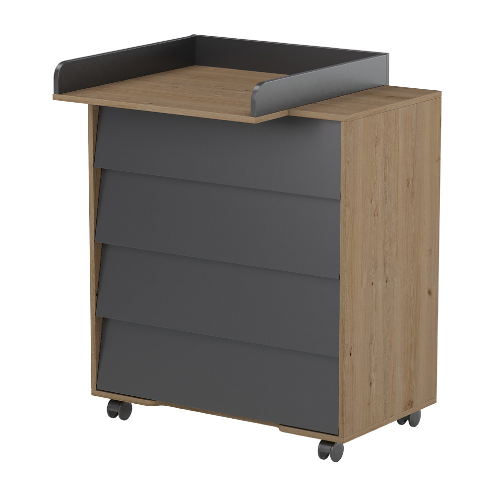 Комод выделяется четырьмя вместительными ящиками с интегрированными ручками, где можно хранить детскую одежду и гигиенические принадлежности. Столик для пеленания раскладывается над верхней крышкой, а будучи сложенным может быть использованным в качестве полки для гигиенических средств. Благодаря боковым бортикам малыш защищен от падения во время массажа или пеленания.