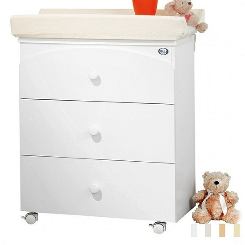 Пеленальный комод дополнен ванночкой и доской для пеленания ребенка. В состав комода входят три вместительных ящика. Пеленальную доску со временем можно снимать. Для удобства перемещения по комнатам предусмотрены колесами и тормоза. Комод выполнен из ЛДСП и покрыт безвредной для здоровья человека краской.