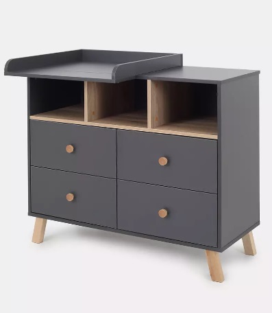 Благодаря комфортной ширине комода в 100 см вы можете легко переодевать ребенка и хранить прямо под рукой предметы гигиены. В устройстве предмета мебели предусмотрены три открытые полки для быстрого доступа к подгузникам и другим нужным вещам. .