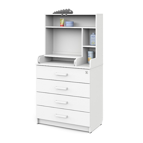 Sweet Baby Albero New — это обновленный пеленальный комод, сочетающий вместительность, функциональность и элегантный дизайн. Его главная особенность — складной пеленальный столик, который легко раскладывается, создавая просторную поверхность с бортиками безопасности для ребенка, и компактно убирается, освобождая место для хранения. Над комодом предусмотрены дополнительные полки, идеальные для размещения детской косметики, игрушек или ночника. Четыре широких ящика на роликовых направляющих обеспечивают плавное и бесшумное открывание, вмещая все необходимое для малыша.
