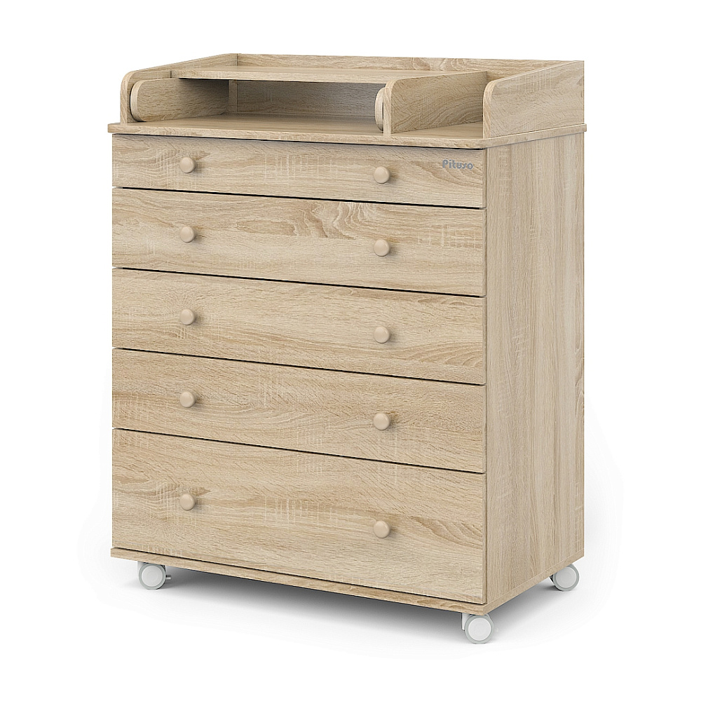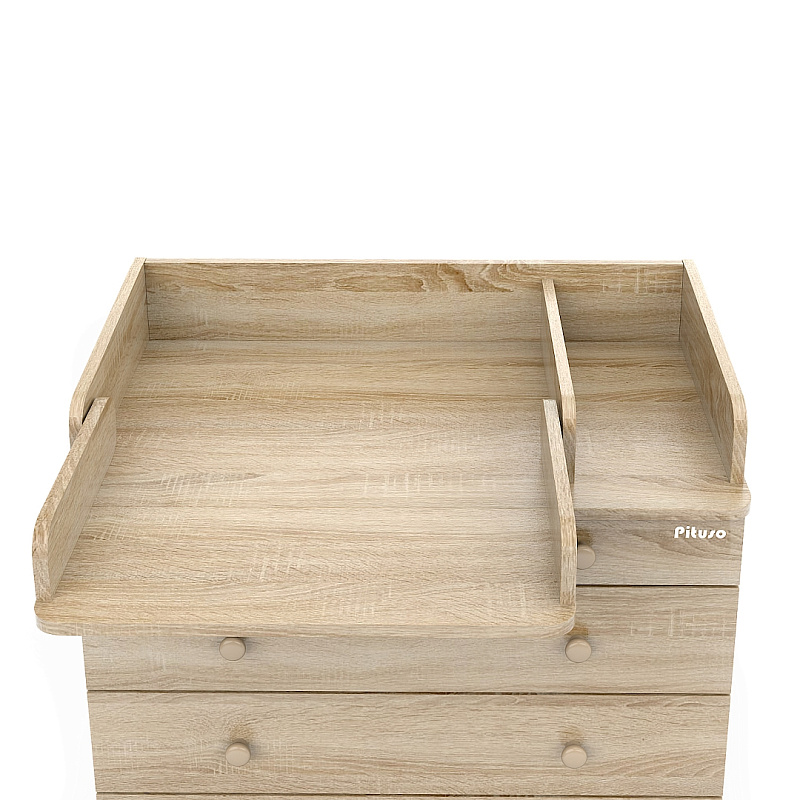 Комод снабжен раскладным столиком для пеленания и пятью ящиками разной глубины. Есть простой и надежный скрытый механизм раскладывания. Имеется отделение возле столика для средств гигиены. Ящики бесшумные, оснащены шариковыми направляющими.