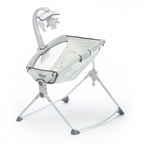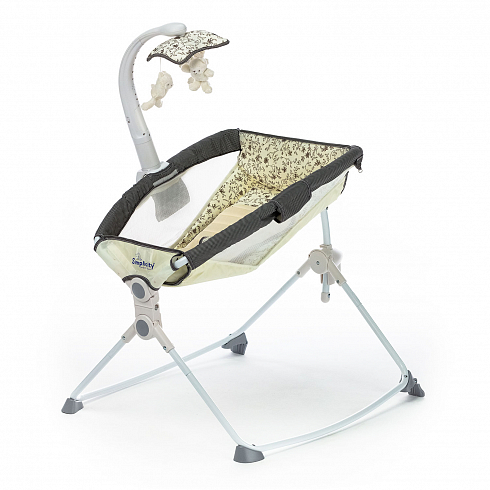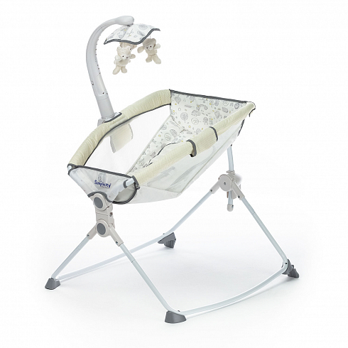 У колыбели анатомически правильное основание. Нужная жесткость обеспечивается специальной вставкой под чехлом, сделанной из пластика. Чтобы дать малышу дополнительный комфорт, имеется мягкий вкладыш, который в точности повторяет форму тела ребенка. За счет сетчатых боковых вставок воздух качественно циркулирует, а благодаря изогнутым ножкам мебель держит нужное положение при качании.