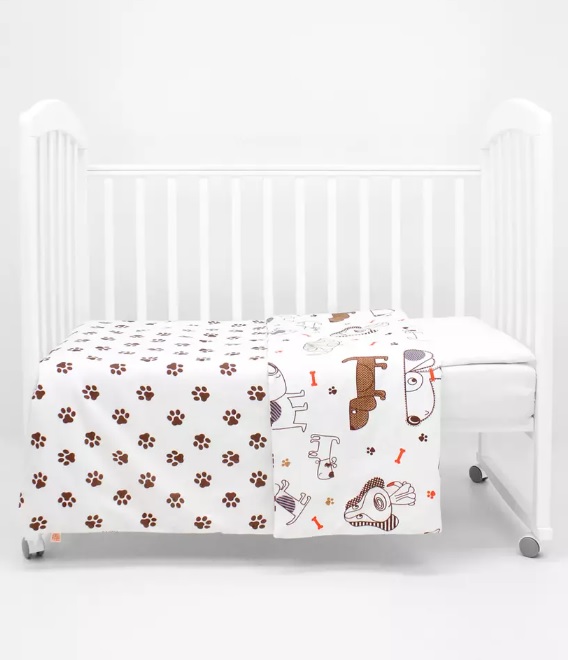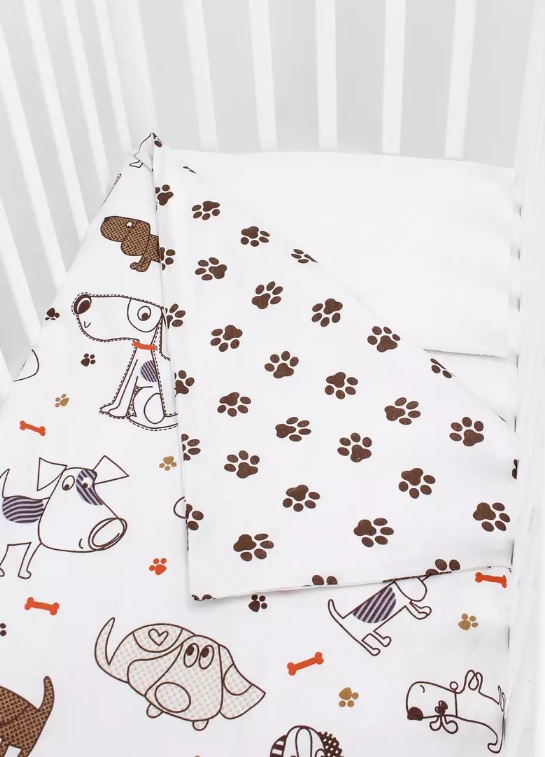 Этот комплект постельного белья для новорожденного состоит из трех предметов. В этой серии представлены пододеяльники с принтами дизайнерского типа в двух вариантах — с веселыми собачками и их следами на тыльной стороне, а также с царскими коронами и звездочками с другой стороны.