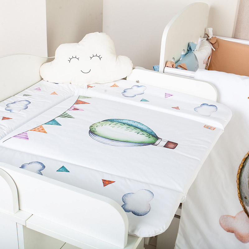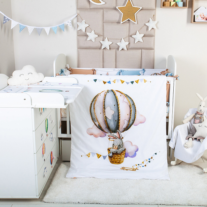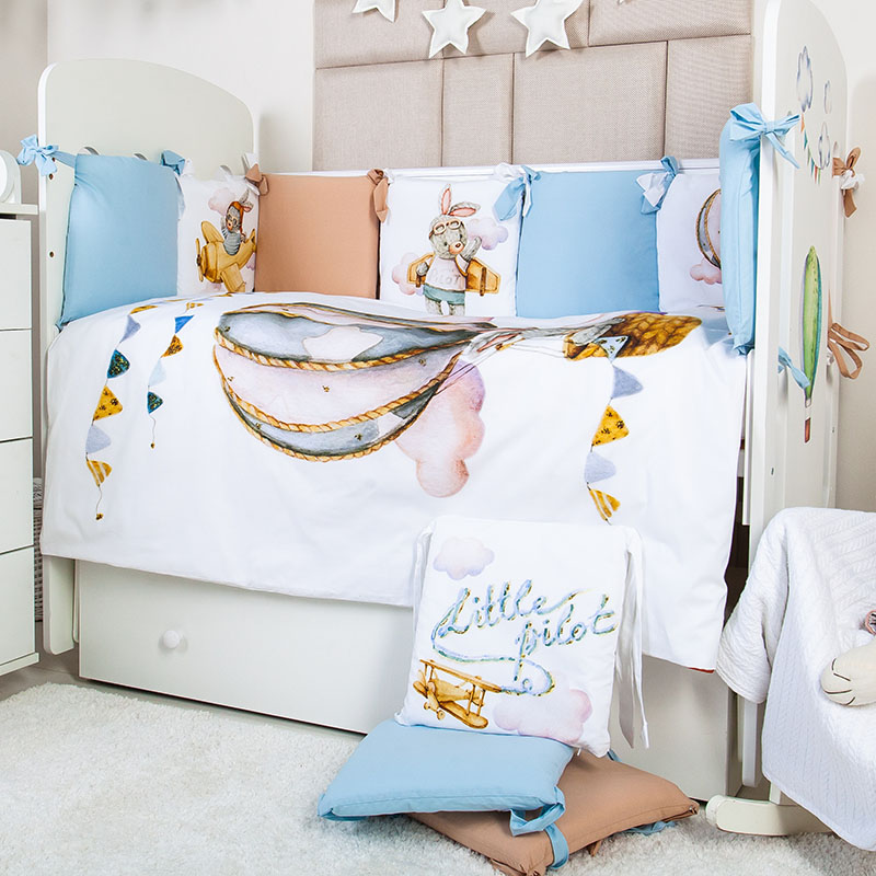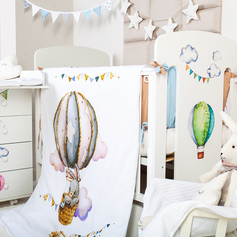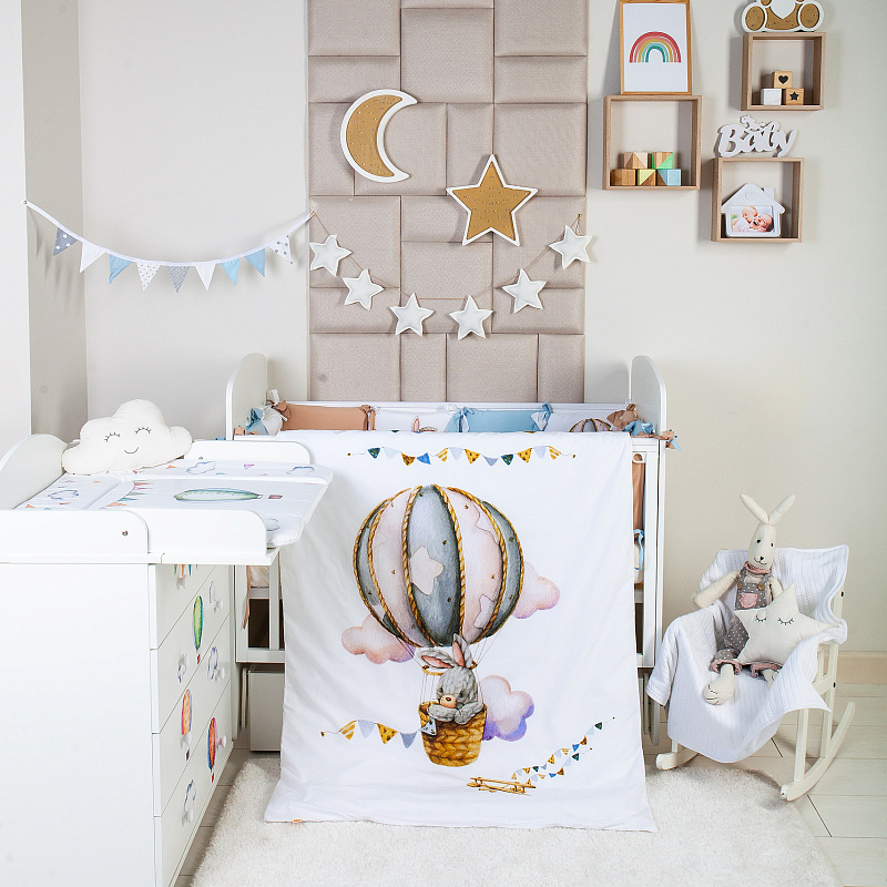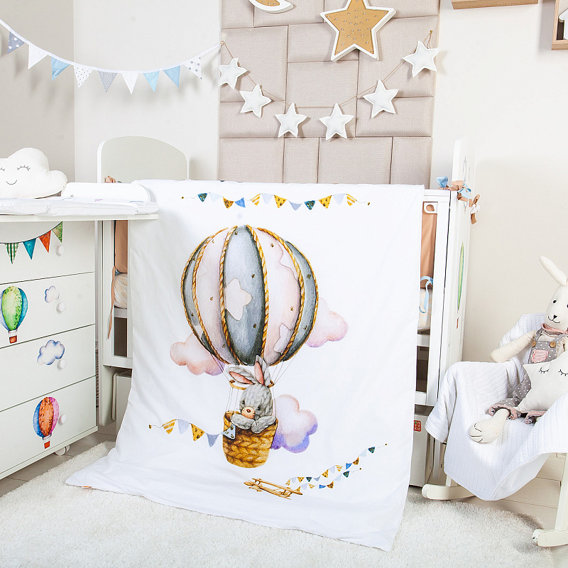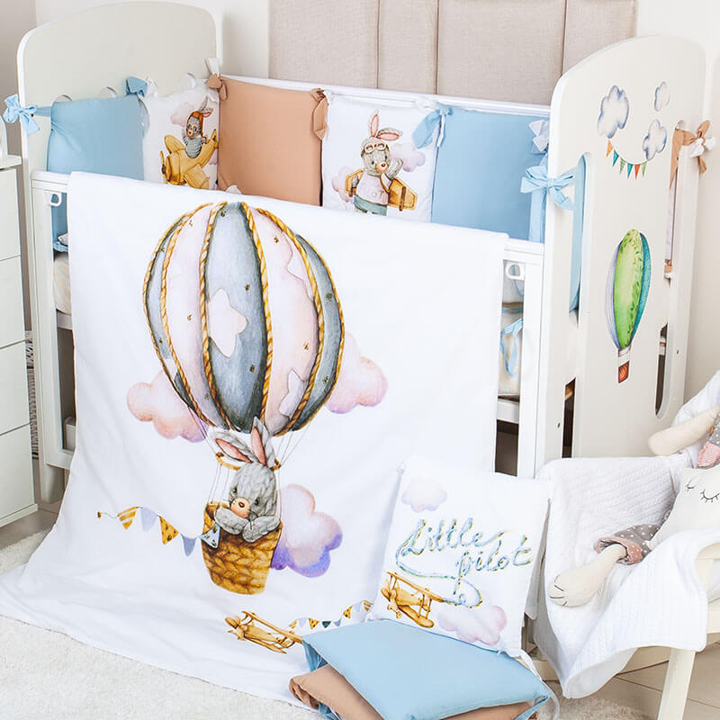 Комплект подходит для кроваток со спальным местом 120x60 см (прямоугольных и овальных). Дизайн — изображение зайчика на воздушном шаре, на самолетике. Подушки бортиков выполнены в белом, бирюзовом и темно-бежевом цвете. Подушки надежно уберегают ребенка от ударов, сквозняка, раздражающих факторов за пределами кроватки. Одеяло легкое и теплое, подушка сделана с учетом анатомических особенностей новорожденных. Простыня надевается на матрас и фиксируется резинкой.