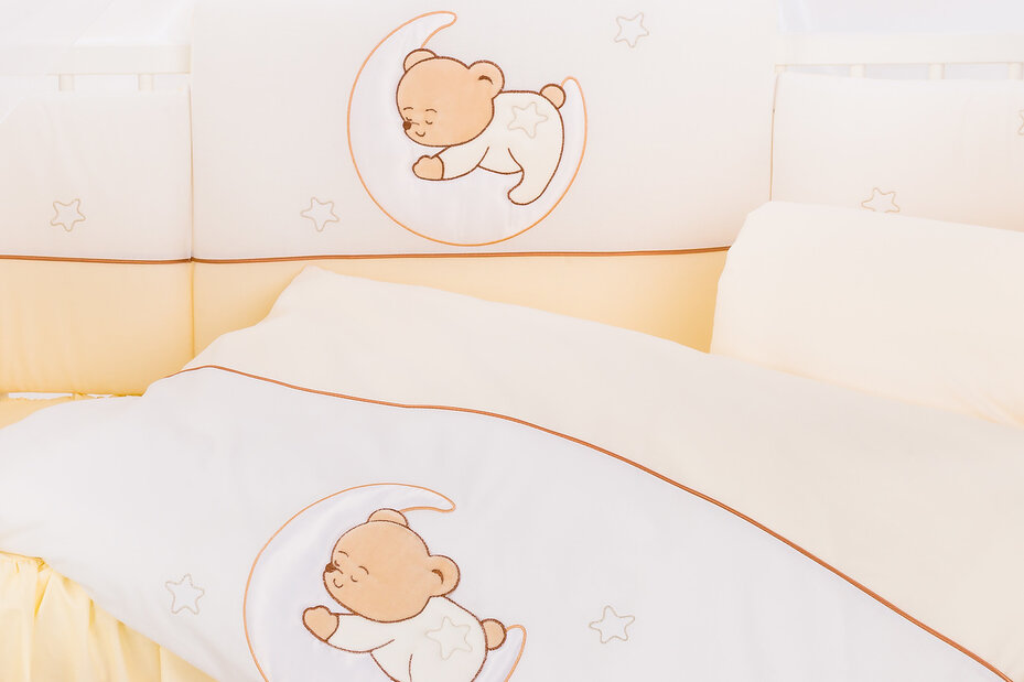 Комплект подходит для кроватей со спальнным местом 120x60 см и 125x65 см. Чехлы бортиков застегиваются на молнию, их можно снимать. Одеяло необычайно легкое, воздушное, не вызывает аллергии.