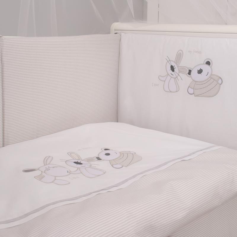 Комплект подходит для кроватей с размером спальных мест - 120x60 см и 125x65 см. Чехлы бортиков застегиваются на молнию, съемные. Одеяло очень легкое, воздушное, гипоаллергенное.