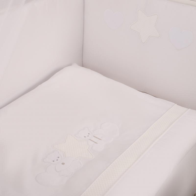Комплект итальянского бренда применяется в кроватках со спальными местами размером — 120x60 см и 125x65 см. Чехлы на бортиках можно снять для стирки и застегнуть на молнию. Одеяло очень легкое и гипоаллергенное.