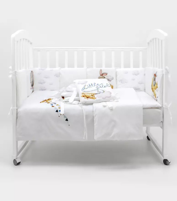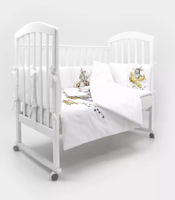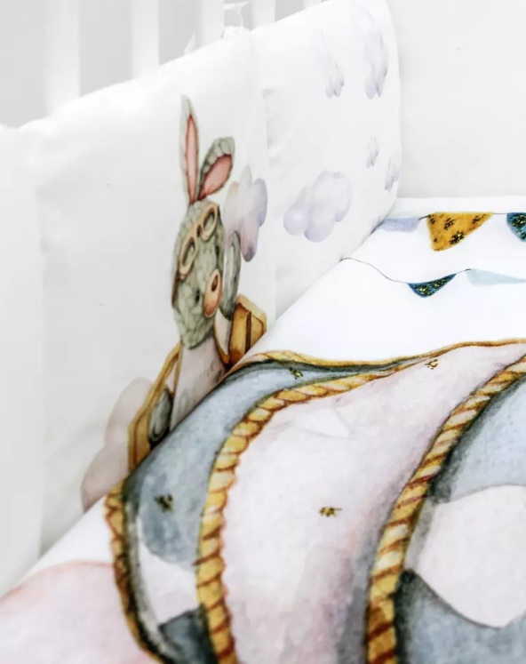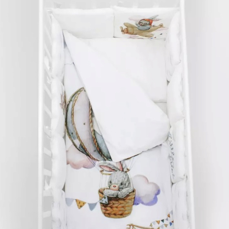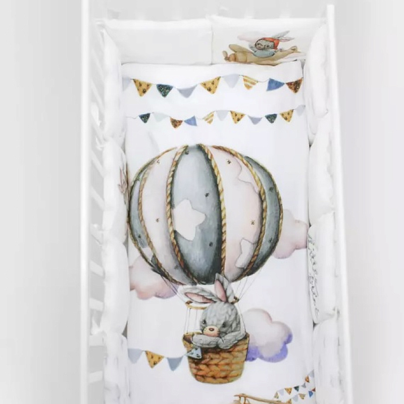 Пододеяльник украшен дизайнерским принтом в виде зайчика на воздушном шаре с флажками и пушистыми облаками. Бортики сделаны из белых подушек, «облаков» и «зайки-пилота». При этом каждый сегмент бортика содержит изображение персонажа с разным сюжетом.