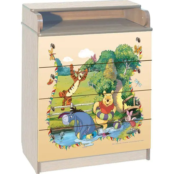 Пеленальный комод Disney КДП Медвежонок Винни укомплектован четырьмя ящиками для хранения детских вещей и пеленальной доской, которою при необходимости можно снять. Фасад Disney КДП Медвежонок Винни выполнен из ламинированных листов ДСП и декорирован изображением диснеевского мишки с друзьями. Рисунки на пеленальном комоде Дисней КДП Медвежонок Винни нанесены с помощью стойкой UF-печати, которая устойчива к агрессии внешних факторов и надолго сохраняет насыщенность цветов.