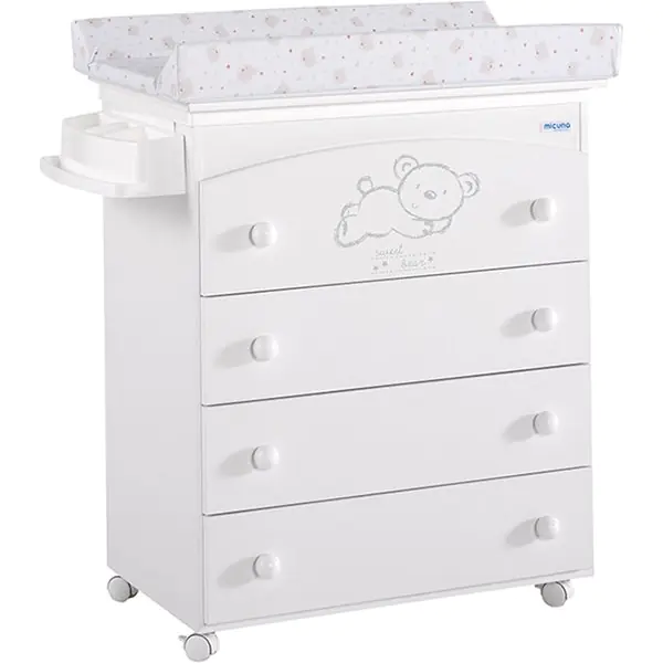 На первый взгляд такой простой и изящный пеленальный комод Miсuna Sweet Bear B-970 с матрасиком способен заменить сразу несколько важных предметом мебели. На его верхней части, оснащенной пеленальной накладкой, удобно переодевать малютку. Для купания в Miсuna Sweet Bear предусмотрена эргономичная ванночка с прочным шлангом для слива воды. Боковая панель пеленального комода Микуна Свит Бир оснащена держателем для полотенца и полочкой для мыла. Когда ребенок подрастет все эти аксессуары можно снять, и получится обычный комод для хранения вещей и прочих принадлежностей.