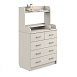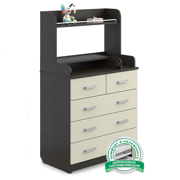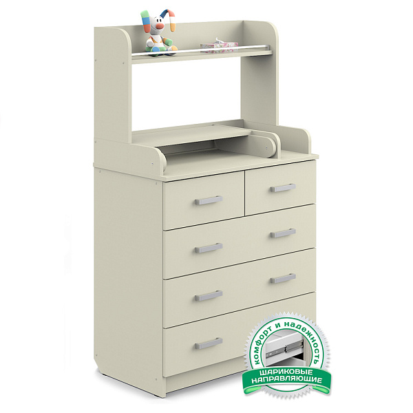 В этом комоде пять ящиков — три широких нижних и два верхних, которые в ширину равны нижним ящикам. Ящики находятся на шариковых телескопических направляющих, а значит работают плавно, без шума, не выезжают произвольно. Наверху оборудован пеленальный столик. Рядом — отделение для средств по уходу за ребенком. С полки предметы не скатываются благодаря ограничителю.